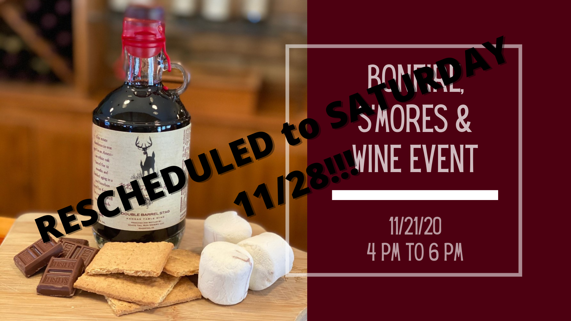 Join us for a socially distanced Bonfire, S'mores & Wine event! We will have firepits strategically placed in the vineyard for guests to roast their own S'mores! **The S'mores are free and only while supplies last.**