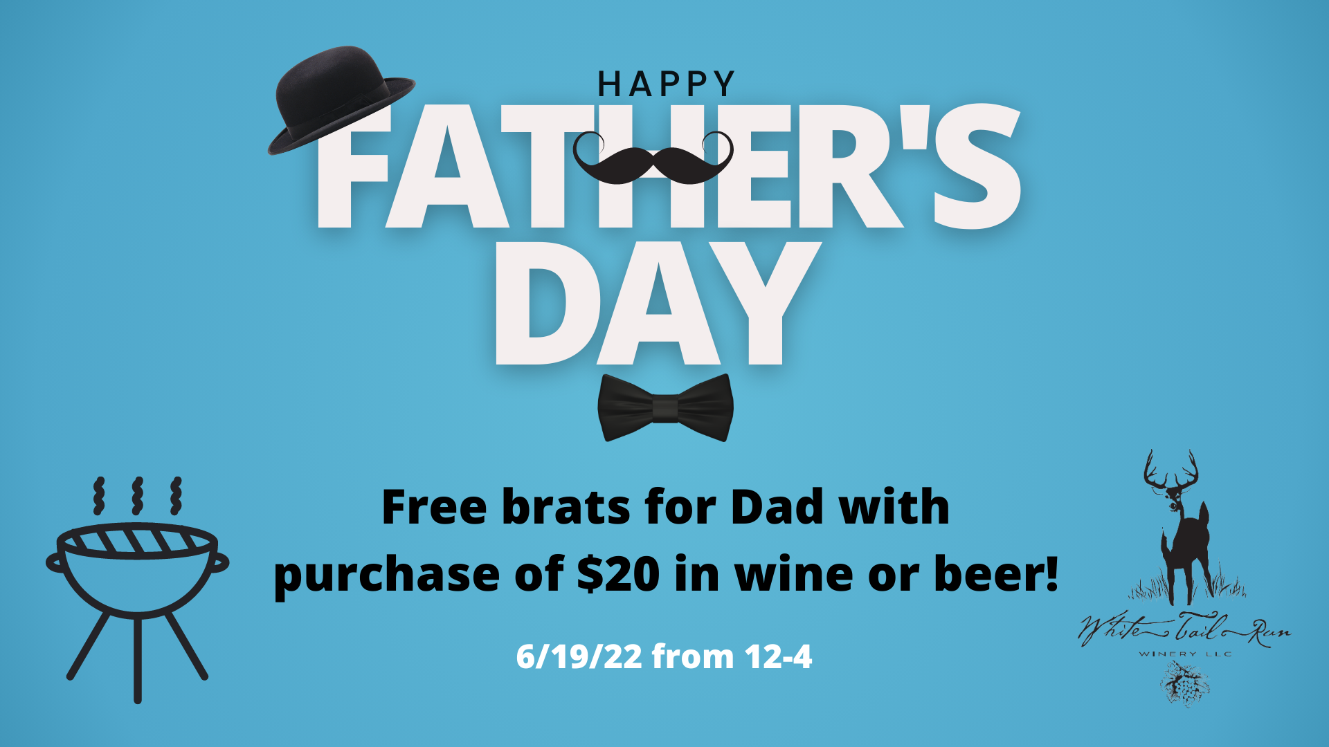 Come celebrate Dad at the Tasting Room! All Dads will get a free package of (uncooked) brats locally made by Jet High Prairie Meats with their purchase of $20 in wine or beer!