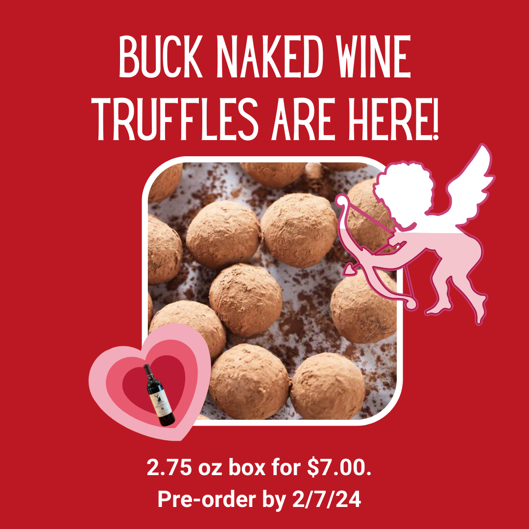 Pre-orders are now open for our popular Buck Naked Wine Truffles! Local farm Peters Family Farm makes these delicious truffles for us. Order some for your Valentine today! Pick up for pre-orders will be at the winery and will start on Friday, 2/9. Message us to place your order today!
