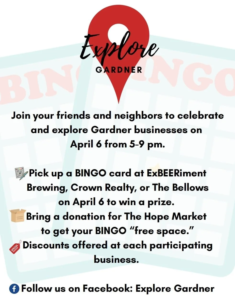 Come play BINGO with over 30 businesses in Gardner on Saturday, April 6th from 5-9pm. With a chance to win one of 4 different gift baskets filled with prizes from participating businesses, and one big blackout prize. Christy will be set-up at Crown Realty selling glasses of wine and unopened bottles for you to enjoy at home. It will be a fun evening and a great way to support local businesses! For more event information click here.